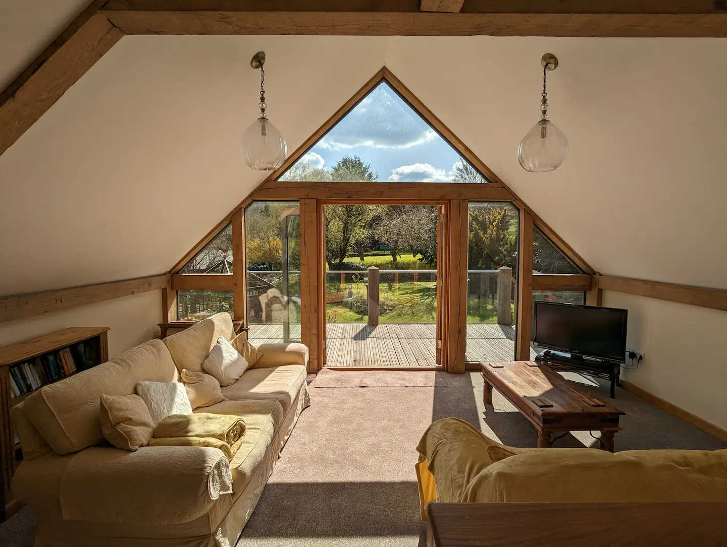 The oak framed house, designed and built by the owners, lies in the grounds of the owner’s home. It is just a 10-minute traffic free stroll into Frome.