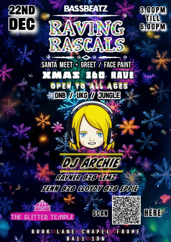 Bass Beatz are bringing the first family-friendly 360 rave to Frome with their Christmas edition of Raving Rascals. Get your tix now for hours of fun, DJs, a Santa meet and greet, face painting and more, all at Rook Lane Chapel. Oh, and its from 3pm – 6pm – slightly more sociable hours than your average rave!